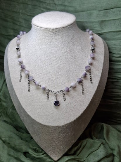 Calcedon-lila Perlenkette. Viel Liebe ins Detail. Mit einem blauen Zirkonia.